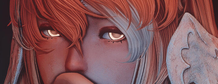 — Finding the half-Raen with a smudge of crimson beneath her chin and nose is not an uncommon sight. On closer inspection, shards of orange crystal rest in her gloved palm after a fit—the same which tend to break off her skin after extensive combat.
